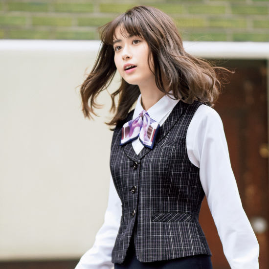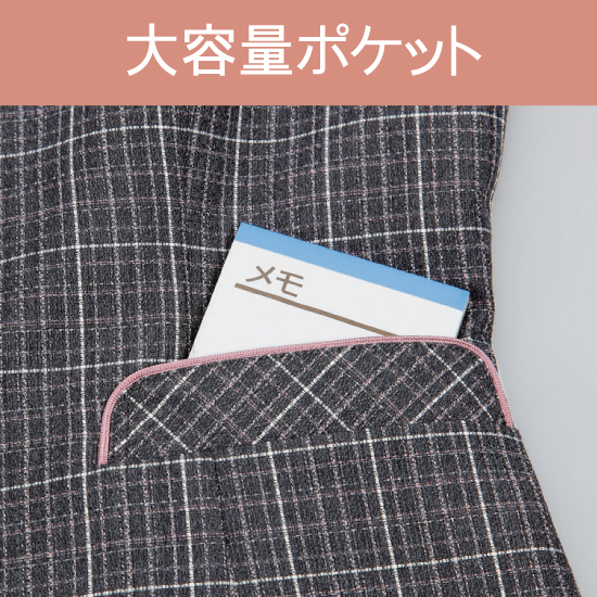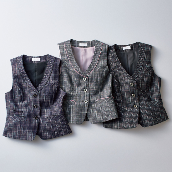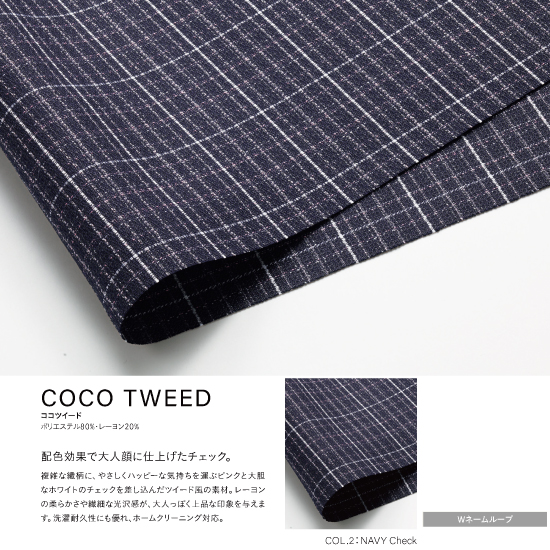 複雑な織柄に、やさしくハッピーな気持ちを運ぶピンクと大胆なホワイトのチェックを差し込んだツイード風の素材。レーヨンの柔らかさや繊細な光沢感が、大人っぽく上品な印象を与えます。洗濯耐久性にも優れ、ホームクリーニング対応のベストです。