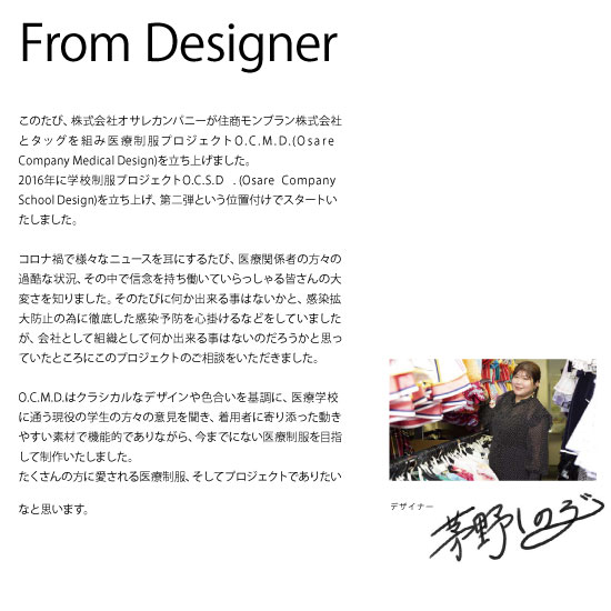 衣装制作会社オサレカンパニーとユニフォームメーカー住商モンブランがコラボし立ち上げた医療制服ブランド「O.C.M.D.」。その新ブランドより動きやすくておしゃれに決まるオールインワンタイプのナース服が登場!